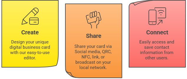 Create, share, and discover professional digital cards effortlessly. No more paper, just seamless networking.